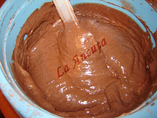 Amestecam faina cu cacaoa si praful de copt si o cernem peste amestecul de oua cu ulei. Amestecam usor, de jos in sus, pana se omogenizeaza.