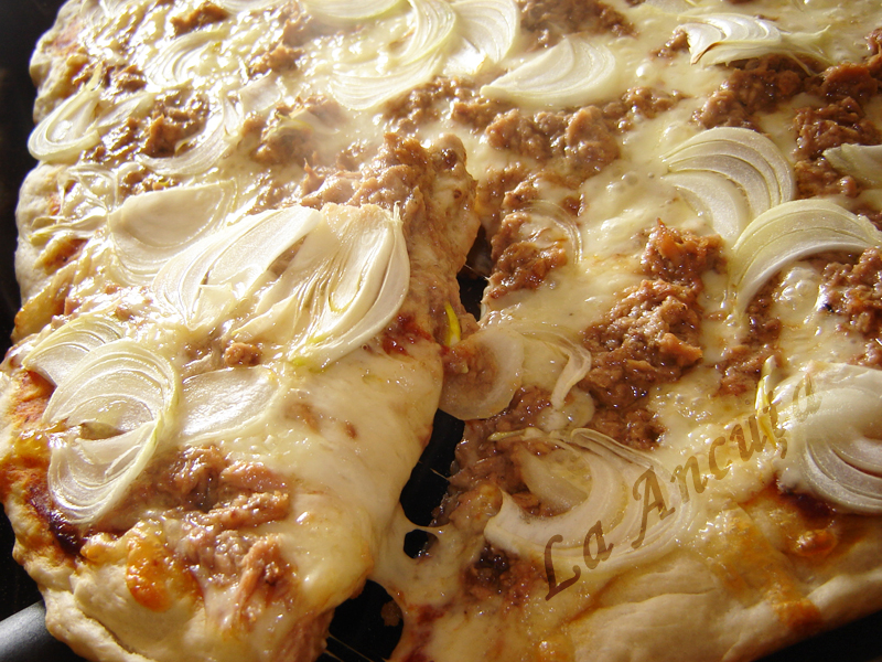 Taiem ceapa julienne si o asezam peste ton. Stropim pizza cu o lingura de ulei de masline.