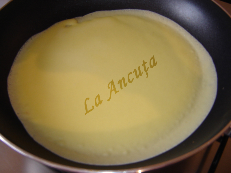 Scoatem aluatul din frigider. Incingem o tigaie antiaderenta. Luam cate un polonic din compozitie si punem in tigaie. Inclinam tigaia pentru a distribui compozitia pe toata suprafata.