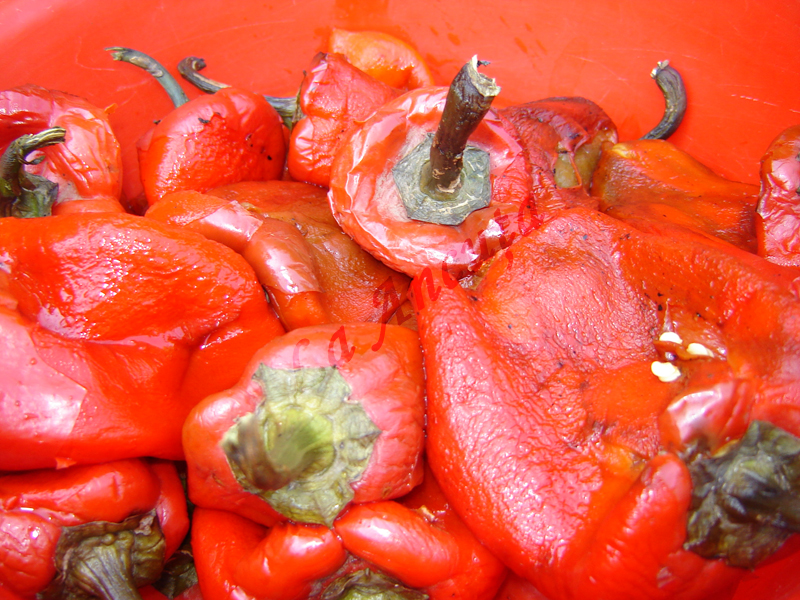 Vinetele si ardeiul kapia le coacem pe plita si le curatam. Putem coace si gogosarul. Eu l-am lasat necopt de data aceasta.
