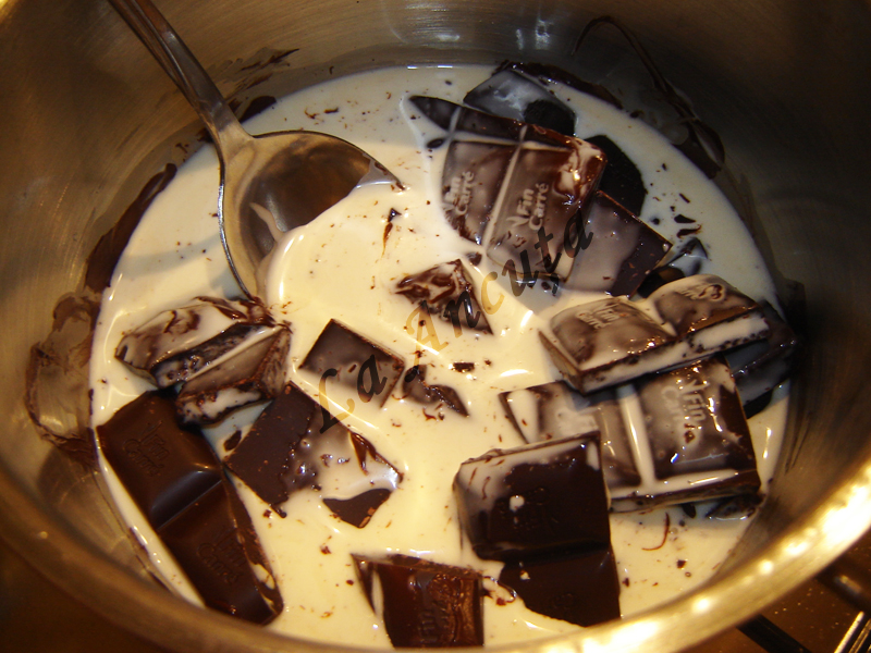 Ciocolata rupta bucati o punem la topit impreuna cu 150 ml de frisca.