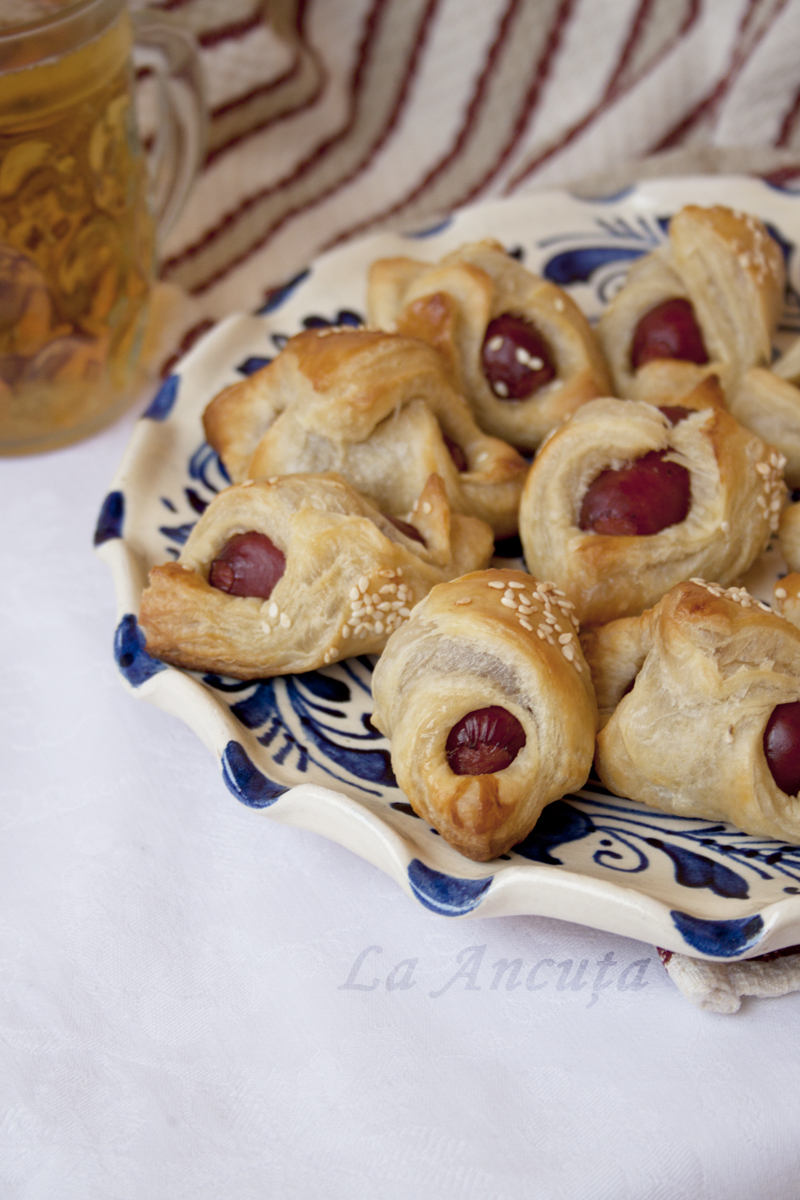 Se pudreaza planul de lucru cu putina faina si se intinde foaia de aluat. Se taie patratele, cu un cutit bine ascutit. In mijlocul fiecarui patratel pozitionam cate un carnacior si invelim (ca la cornulete).