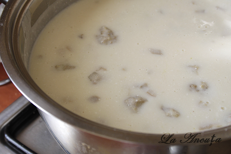 Topim untul iar apoi adaugam faina si amestecam energic, ca sa nu se arda. Dam de pe foc si adaugam supa de carne si vinul amestecand continuu, pentru a nu se face cocoloase.