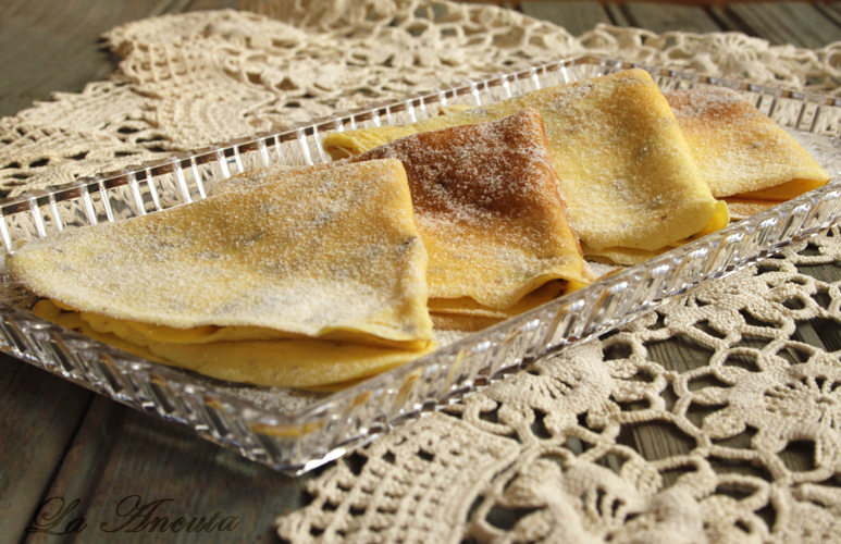 Scoatem clatitele pe o farfurie si le impaturim in 4. Pudram cu zahar si servim cat sunt inca calde.