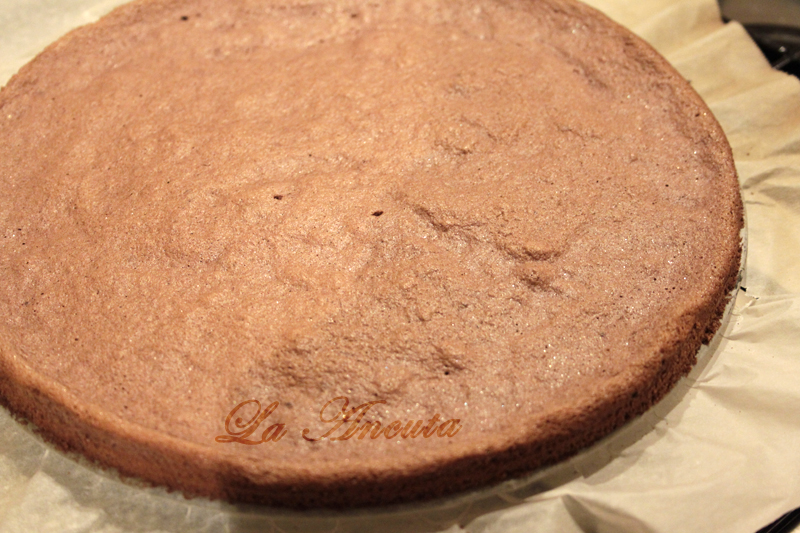 Turnam aluatul in tava rotunda (26 cm) tapetata cu hartie de copt si coacem la foc potrivit timp de 12-15 minute, sau pana trece testul scobitorii. Scoatem foaia pe un gratar de bucatarie si o lasam la racit apoi indepartam hartia.