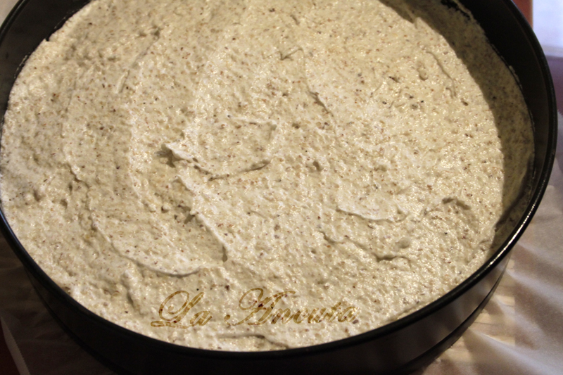 Pentru blatul de bezea mixam bine albusurile cu un praf de sare iar apoi adaugam zaharul si mixam pana se topeste si spuma luceste. La final adaugam nuca prajita si macinata amestecata cu faina. Amestecam usor, pana se incorporeaza.