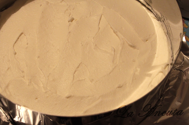Pentru crema mixam smantana pana devine pufoasa iar apoi adaugam zaharul si mai mixam putin.