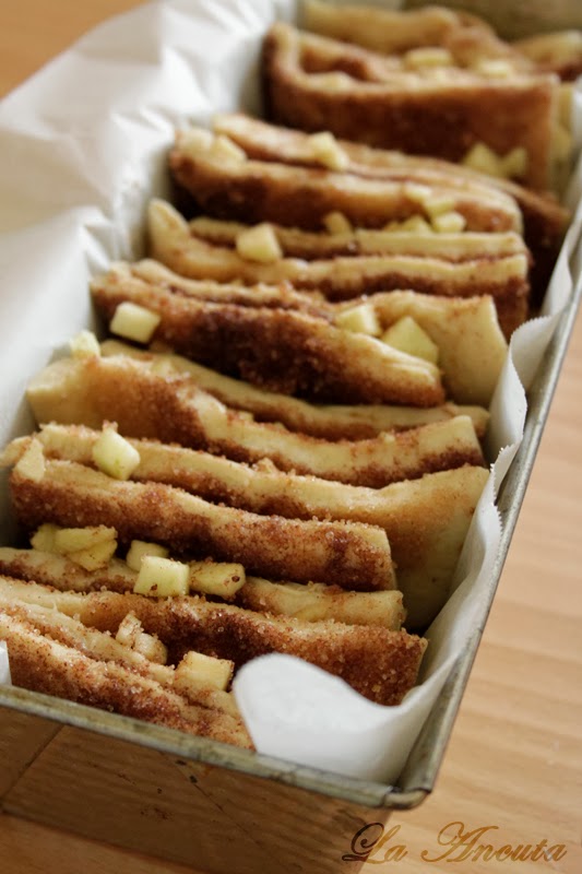 Taiem foaia in fasii de latimea tavii pentru cozonac. Presaram bucatele de mar pe prima fasie iar apoi o acoperim cu cea de-a doua fasie. Procedam la fel si cu restul fasiilor de aluat (eu am avut 4). Taiem apoi la interval de ~10 cm.