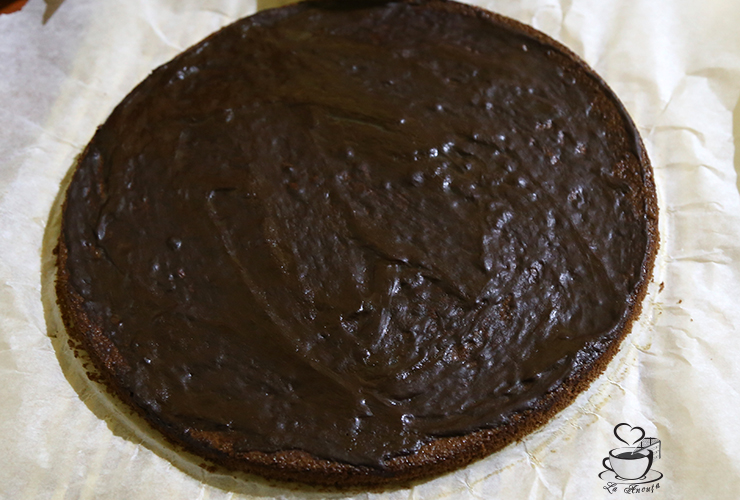 Impartim compozitia in trei parti egale si coacem trei foi, in tava rotunda (26 cm), tapetatat cu hartie de copt. Coacem foile la 180ºC, timp de ~15 minute.