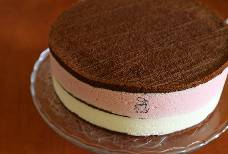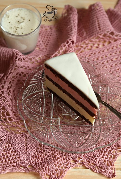 Scoatem tortul din frigider si asezam al doilea blat uns cu ciocolata, apoi turnam crema de zmeura si nivelam. Acoperim cu blatul ramas (cel neglazurat) si dam tortul la frigider pentru 2-3 ore, sau de preferat peste noapte.