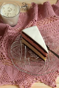 Pe un platou asezam unul din blatuile unse cu ciocolata apoi montam inelul de tort in jurul lui. Turnam crema de ciocolata alba si nivelam.